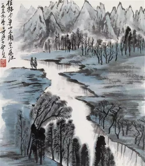 老舍曾在1944年看完李可染水墨写意画展之后写了评论,其中建议李可染要将意境拓新,“凭可染兄的天才与功力,假若他肯试验‘新诗',我相信他必定会赶过望云去的”。1959年李可染终于悟出将“新诗入画”在写生中创造新意境,他选择毛泽东诗词作为其“诗意化”意境的载体创作出《六盘山》,这与当时的政治需求有关,也和毛泽东诗词的恢宏大气磅礴之气概与李可染想要“为祖国河山立传”的决心,以及他倾向于整体山河的现代意象审美有关。李可染最为人称道的“万山红遍”系列作品从体现原文转变为追求意境上的技法与情趣变化,而后的漓江和井冈山写生可以看作“毛泽东诗意画”与“师造化”融会在一起的新境界绘画。这种“新诗入画”目的在于追求有现代意象和祖国河山的磅礴之气,同一时代如傅抱石、关山月等人也进行了类似的“毛泽东诗意画”这类政治形态较强的绘画,对新气象新境界山水画的发展起到推动作用。李可染对古法写生的态度是坚持用最大的力气打进去再打出来,主张从传统内部开拓创新。在变革山水画的探索中,他通过合理借鉴西方绘画如光影明暗、透视比例、素描水彩等表现方法,将中国传统笔墨皴法和山水布局与之相融,目的是为祖国山川立传。李可染从全新的时代面貌和社会气息出发,创造出一种“深秀瑾密”的现代山水意境[4]。他拓展了山水画的审美意蕴,摆脱了含道映物的传统山水画中所营造出的玄之又玄、物我两分的“天人合一”境界,转向了追求真山水真感觉的自然美和艺术典型。李可染完成了中国与西方、写实与写意、传统笔墨与时代精神的深层结合,实现了山水画的现代化转型,并影响了一大批山水画家,促进了山水画的新发展。